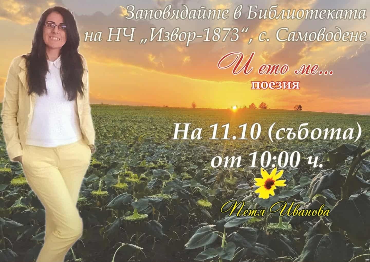 Нека всеки, който има желание и възможност, се чувства добре дошъл в библиотеката при НЧ „Извор-1873“, с. Самоводене, на ул. „Отец Паисий“ №5 да съпреживеем заедно моите стихове, в които дишам, изповядвам се, благодаря…